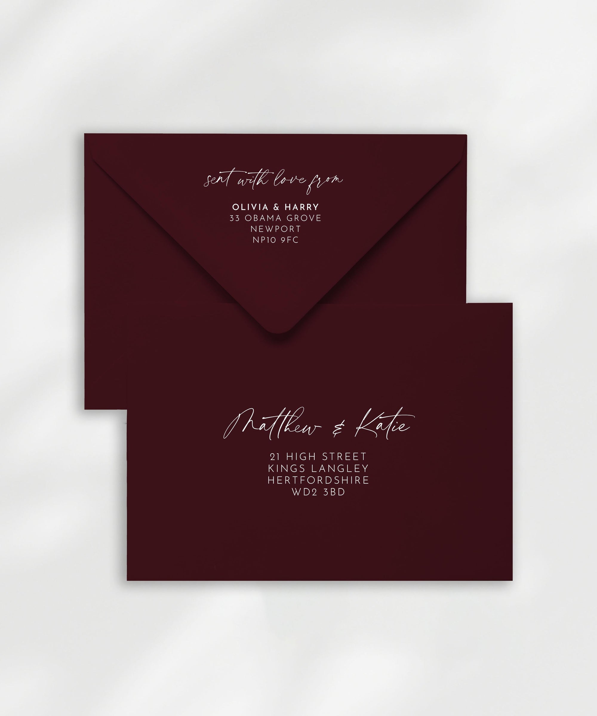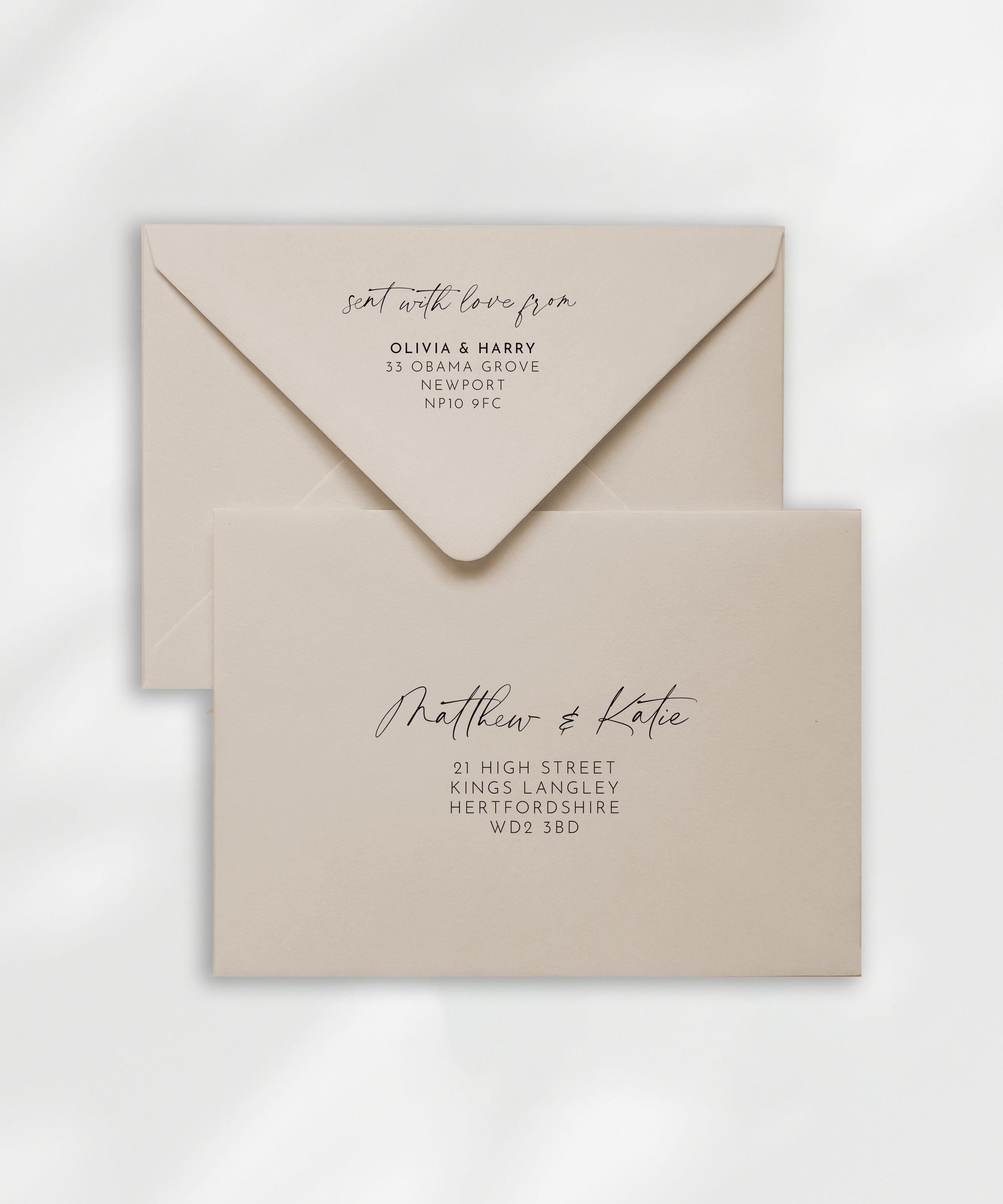 Elevate your envelopes with our guest name and address printing service; perfect for your wedding invitation and RSVP stationery. This listing includes envelopes and address printing.