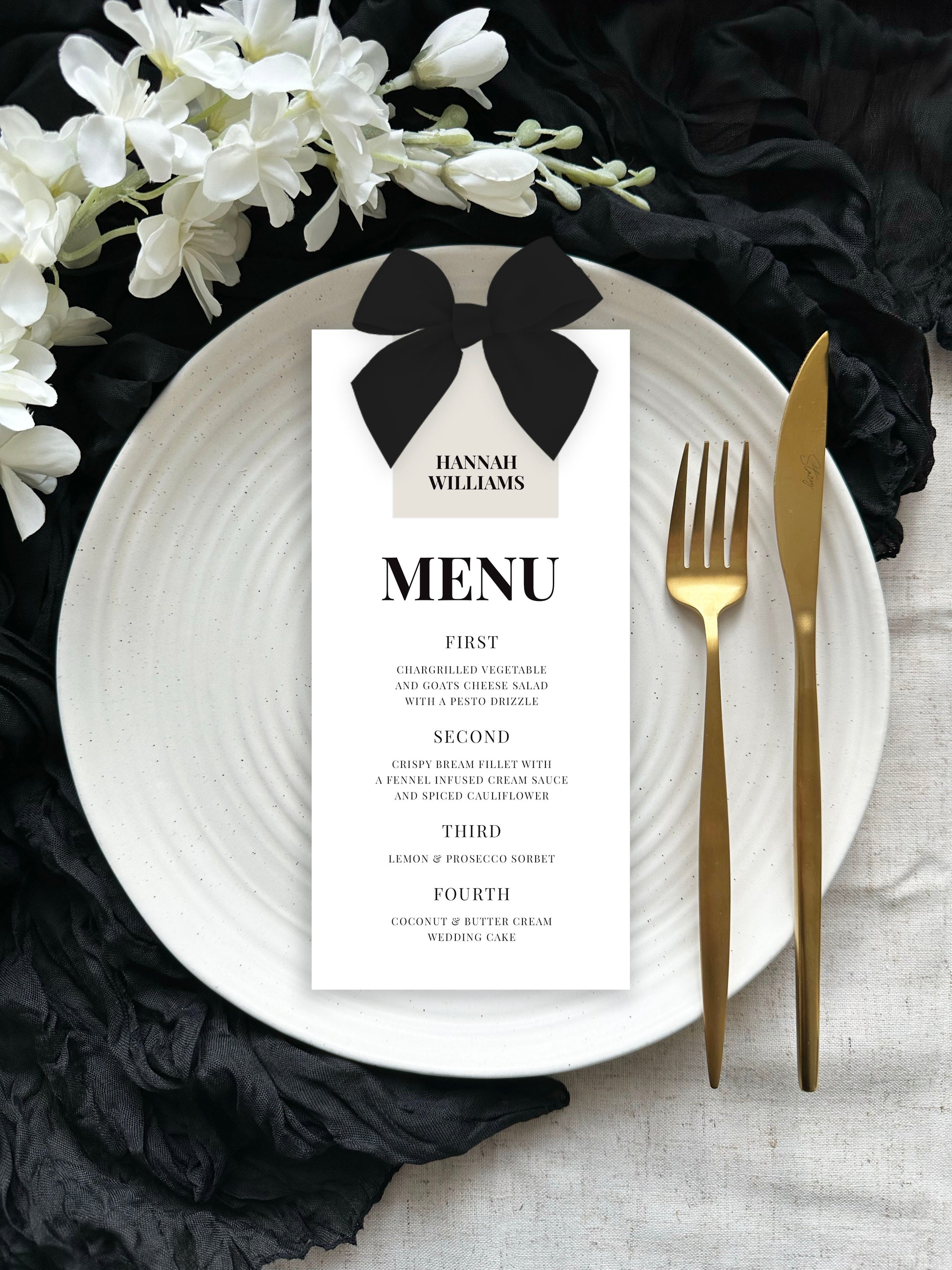 Each set includes a menu, guest name tag and ribbon. The listing price includes one menu variation only, if you require more, please get in touch before ordering. Your menus will arrive unassembled.