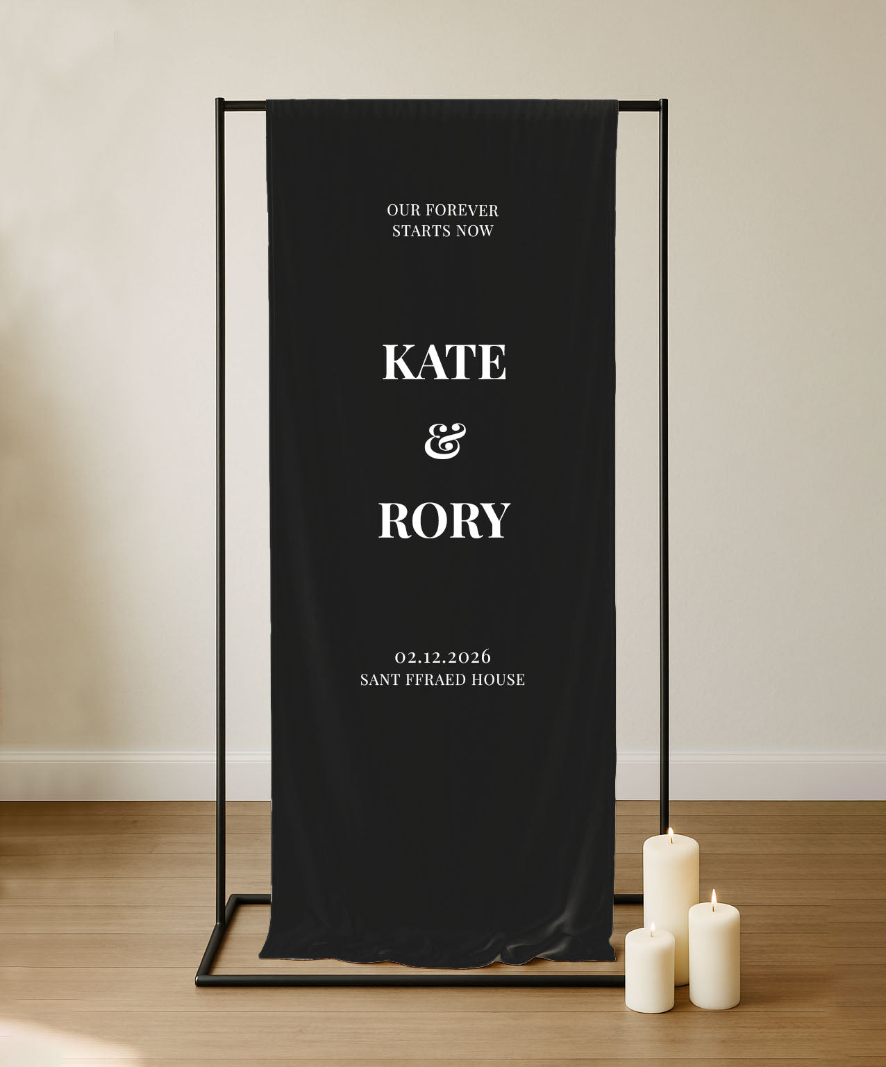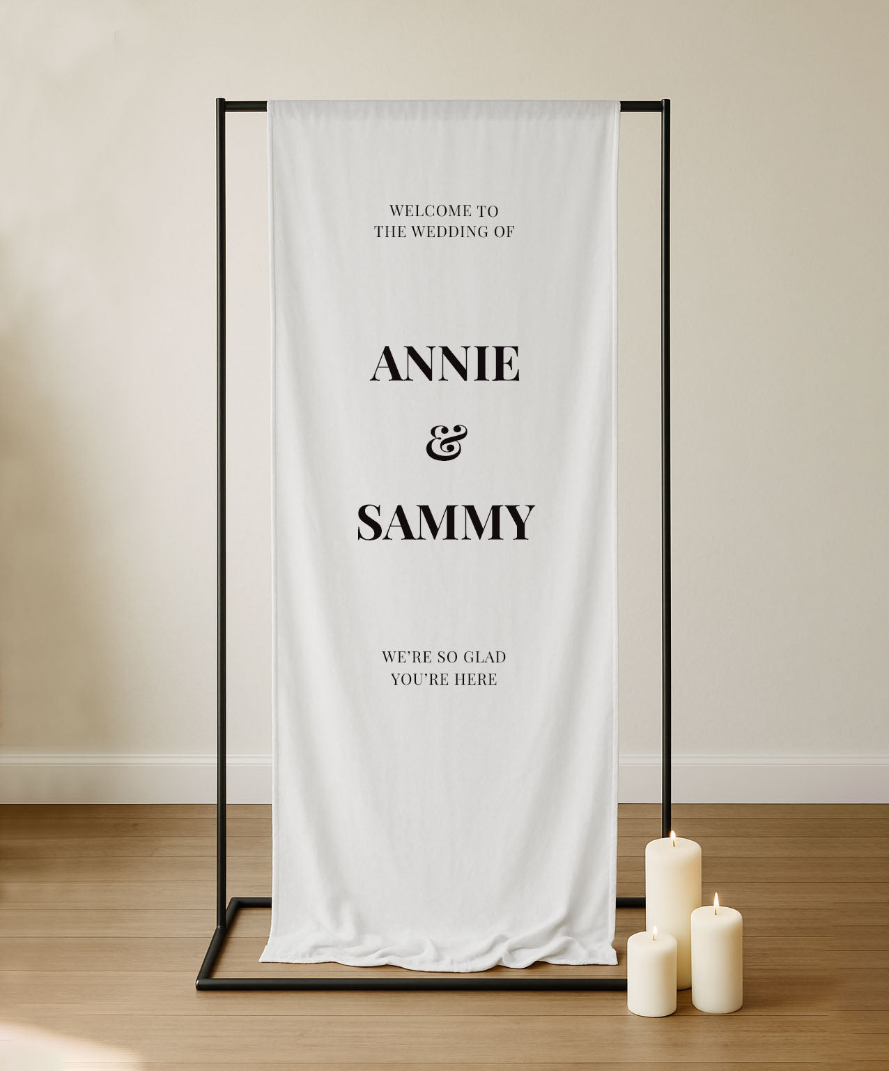 Fabric welcome sign featuring a folded top edge pocket. This sign can be hung using a stand or by feeding ribbon through the top pocket and fixing either end.