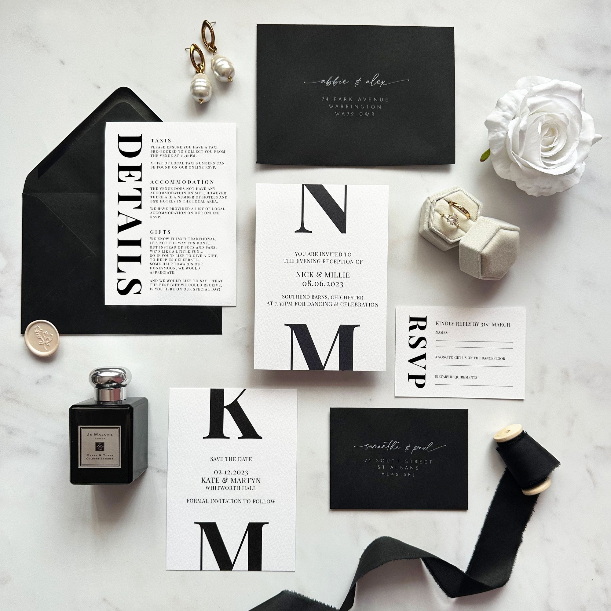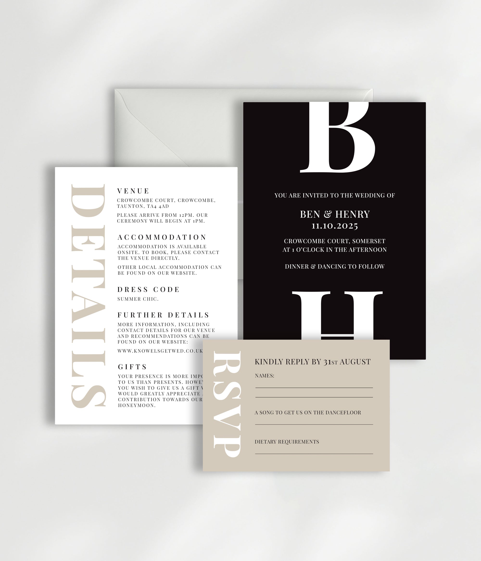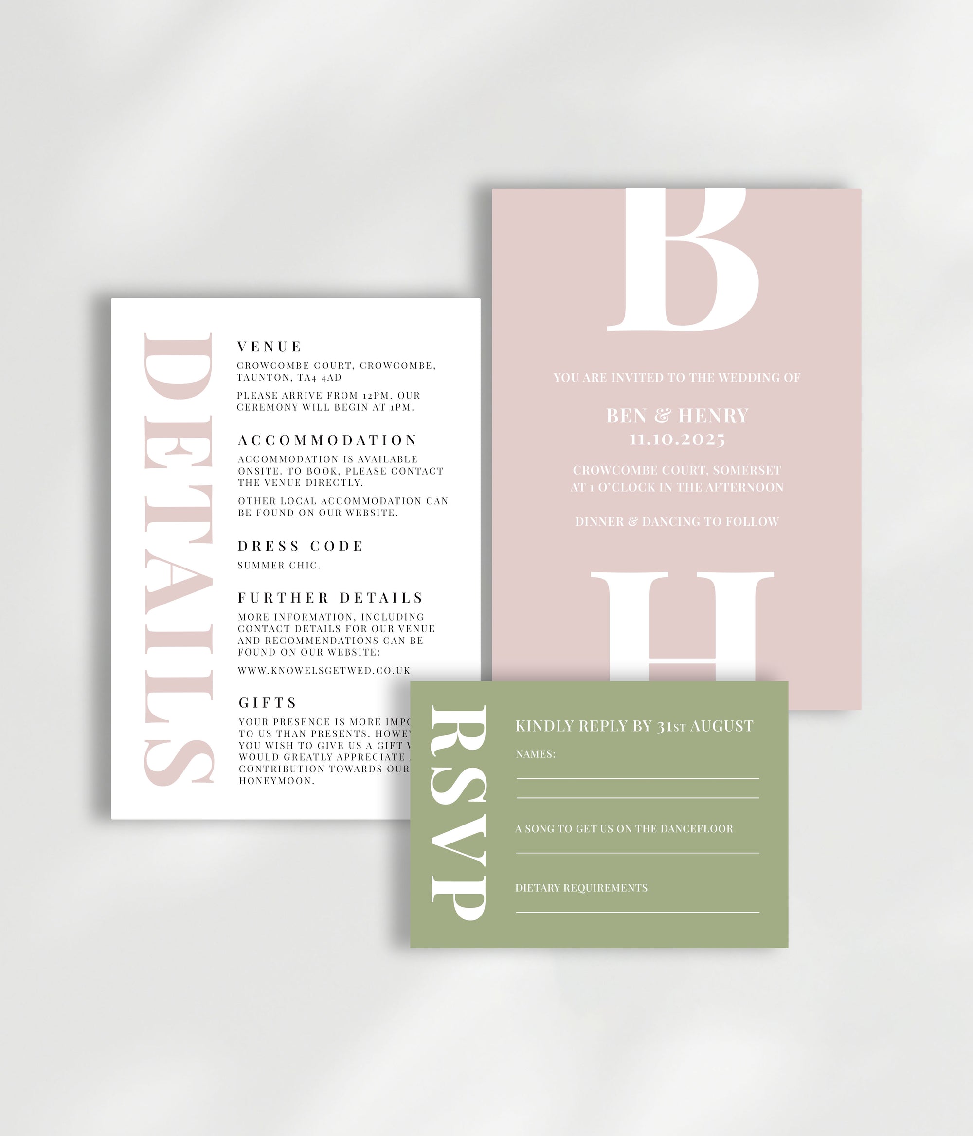 This three card suite contains an invitation card and two additional insert cards (that can be used as a details card, menu card, or RSVP card). You will receive a digital copy to approve prior to printing. Your invitations will arrive unassembled.