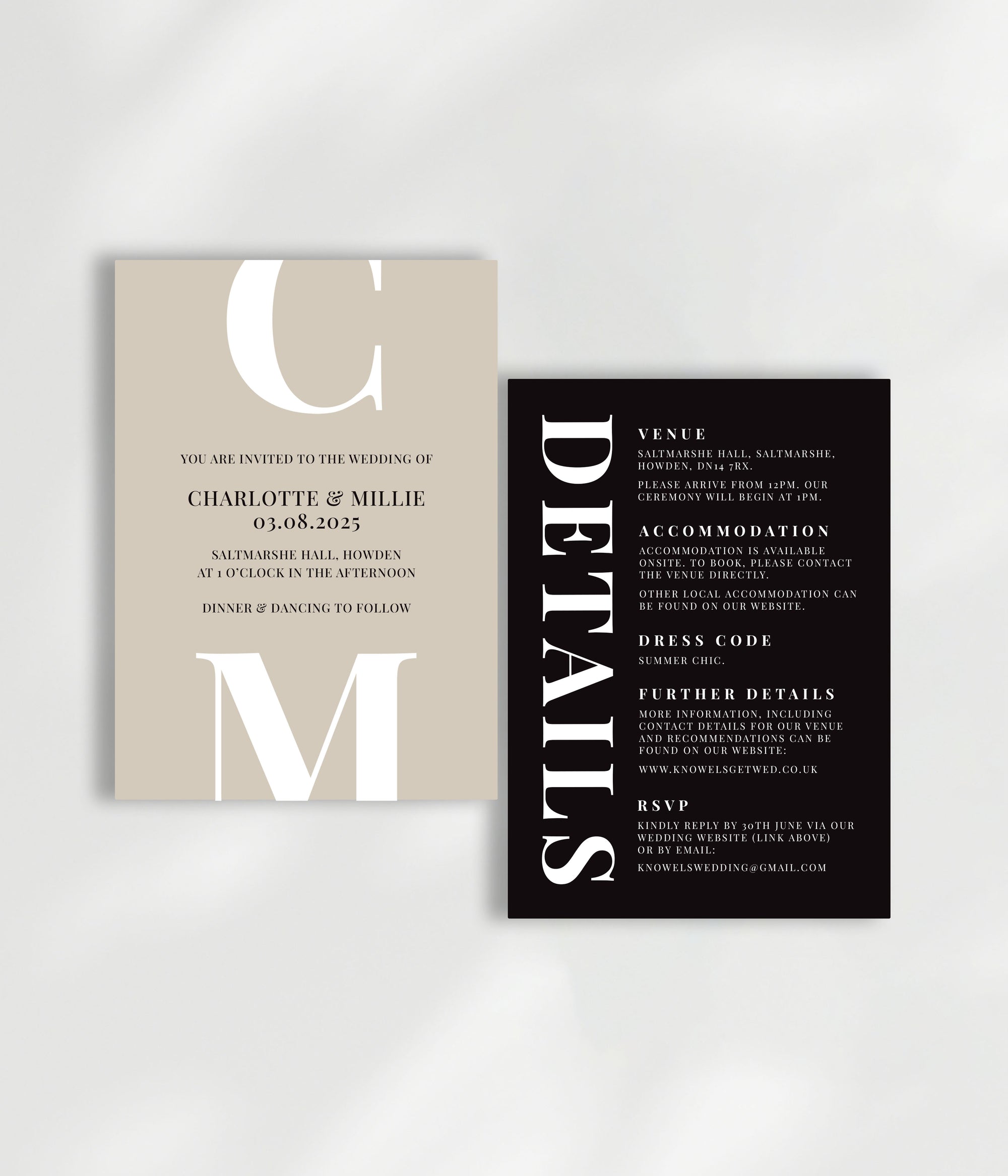 This two card suite contains an invitation card and an additional insert card (that can be used as a details card, menu card, or RSVP card). You will receive a digital copy to approve prior to printing. Your invitations will arrive unassembled.