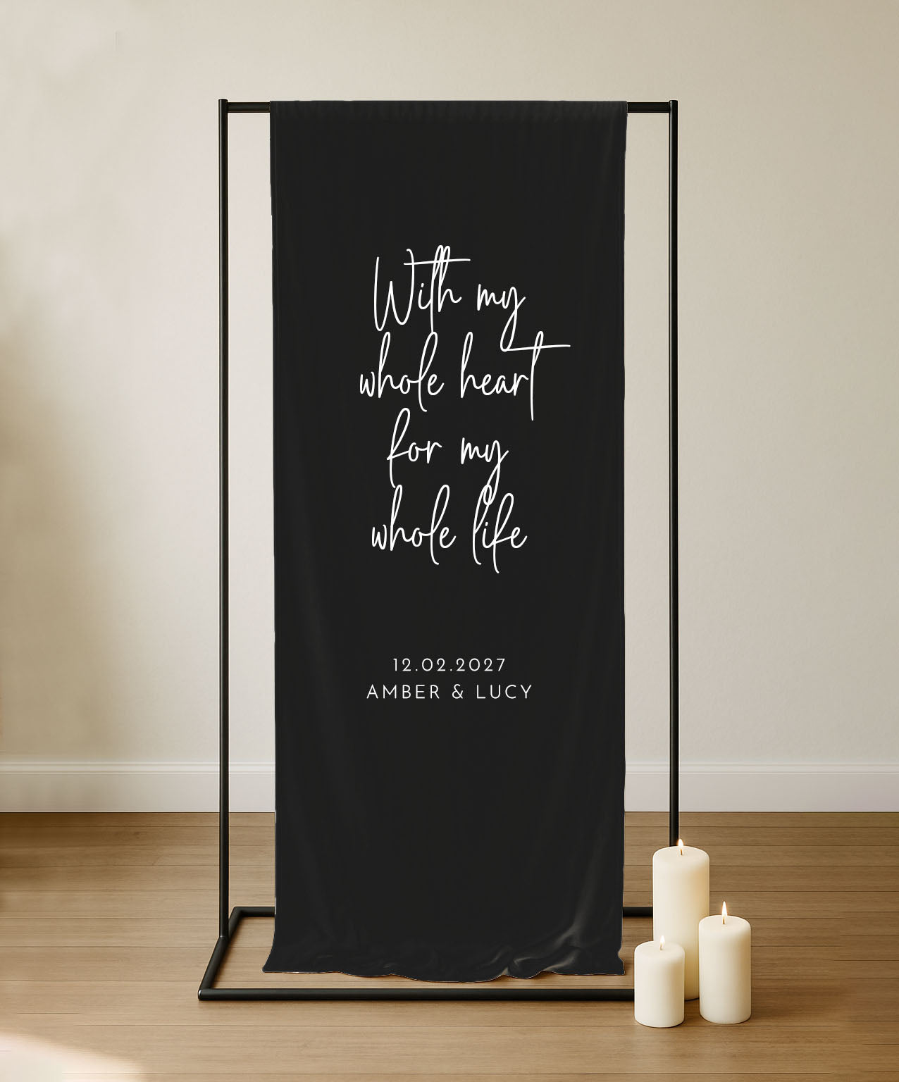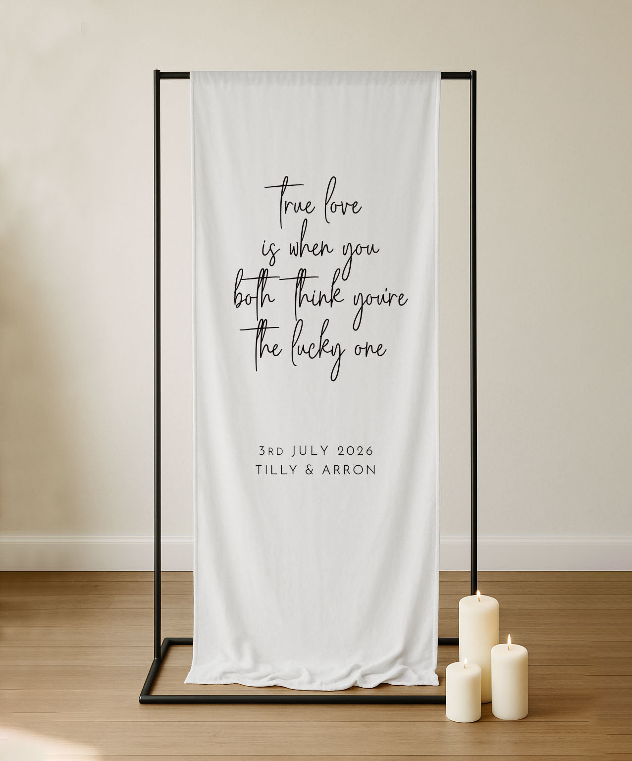 Fabric quote sign featuring a folded top edge pocket. This sign can be hung using a stand or by feeding ribbon through the top pocket and fixing either end.
