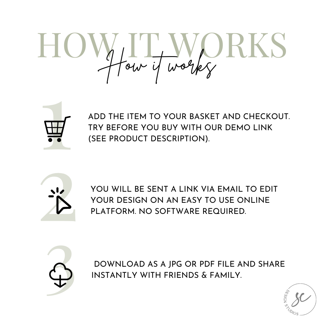 Calling all DIY couples! If you’re looking for a stylish and modern way to announce your wedding day, our editable digital save the date template is perfect for you. Featuring a timeless design and fully customisable layout, you can personalise every detail in minutes. Edit directly from your phone or desktop (no design skills needed) using an easy online editor. Personalise colours, wording and the layout to suit your wedding style, then download and send via WhatsApp, email or text.