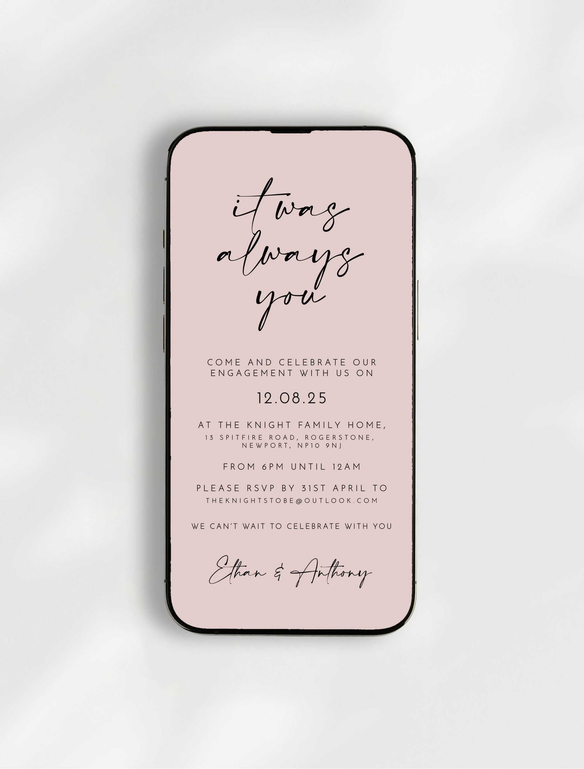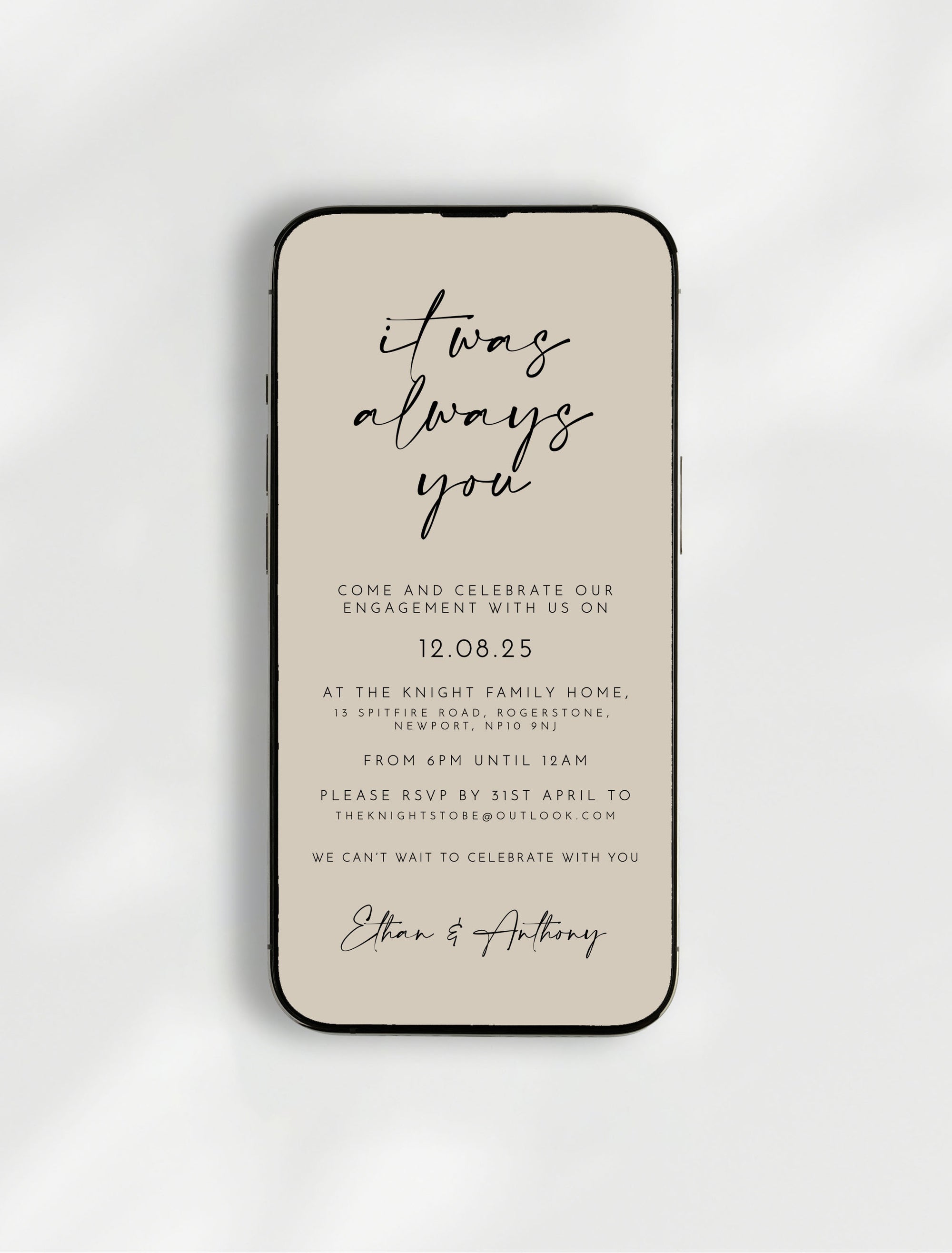 Calling all DIY couples! If you’re looking for a stylish and modern way to announce your engagement party, our editable digital invitation template is perfect for you. Featuring a timeless design and fully customisable layout, you can personalise every detail in minutes. Edit directly from your phone or desktop (no design skills needed) using an easy online editor. Personalise colours, wording and the layout to suit your wedding style, then download and send via WhatsApp, email or text.
