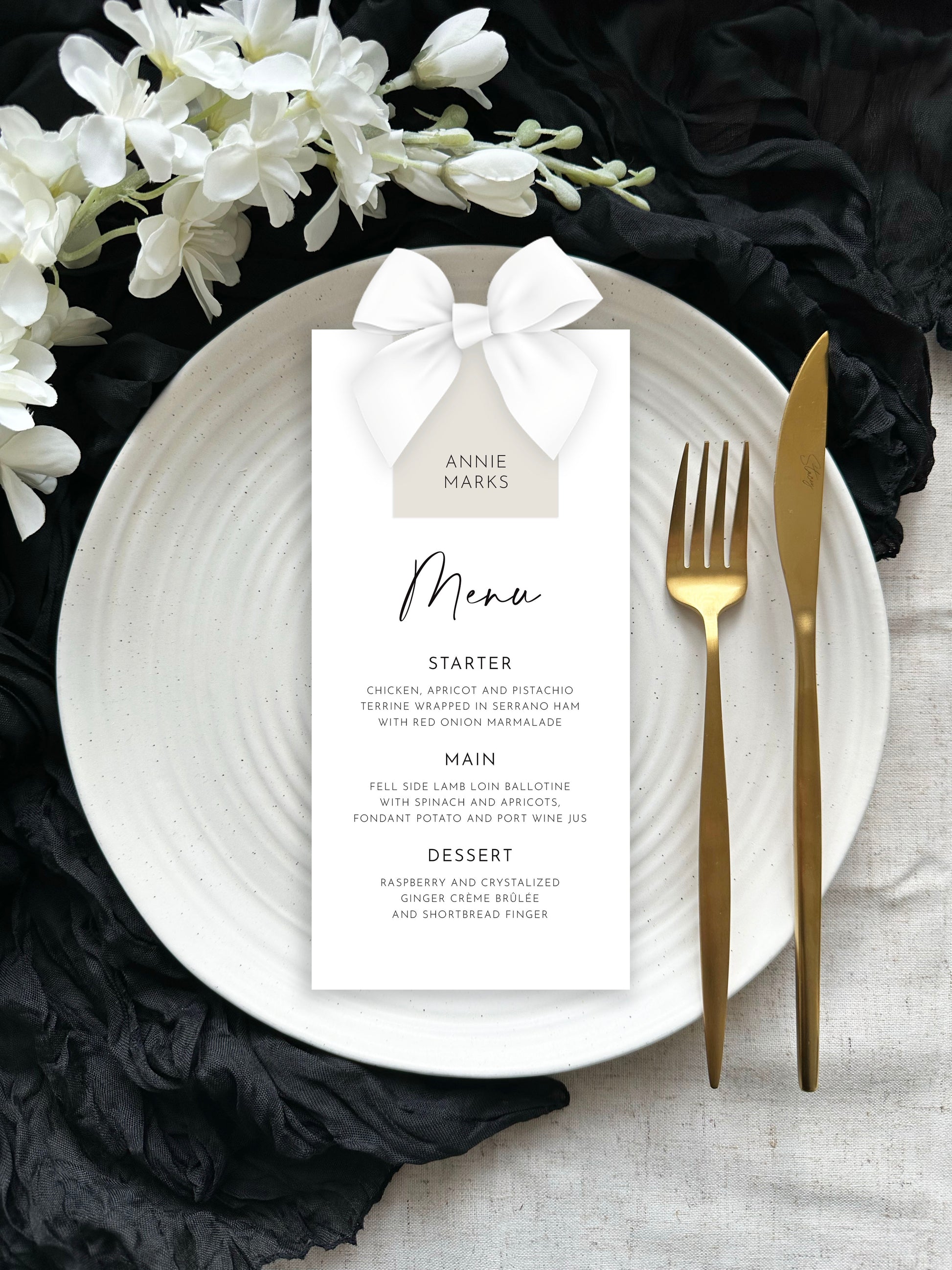 Each set includes a menu, guest name tag and ribbon. The listing price includes one menu variation only, if you require more, please get in touch before ordering. Your menus will arrive unassembled.