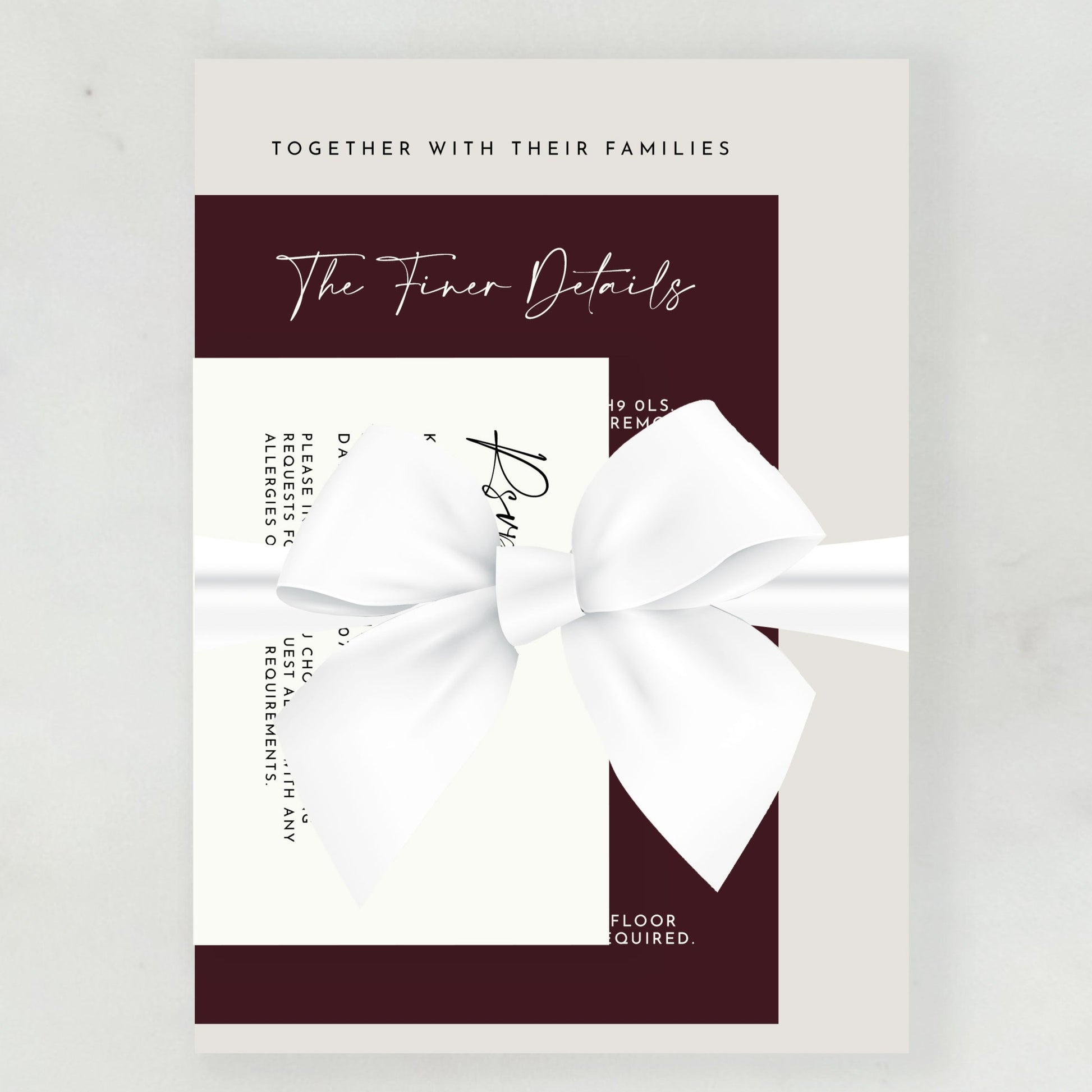 This three card suite contains an invitation card, two additional insert cards (that can be used as a details card, menu card, or RSVP card), a clip and ribbon. You will receive a digital copy to approve prior to printing. Your invitations will arrive unassembled.