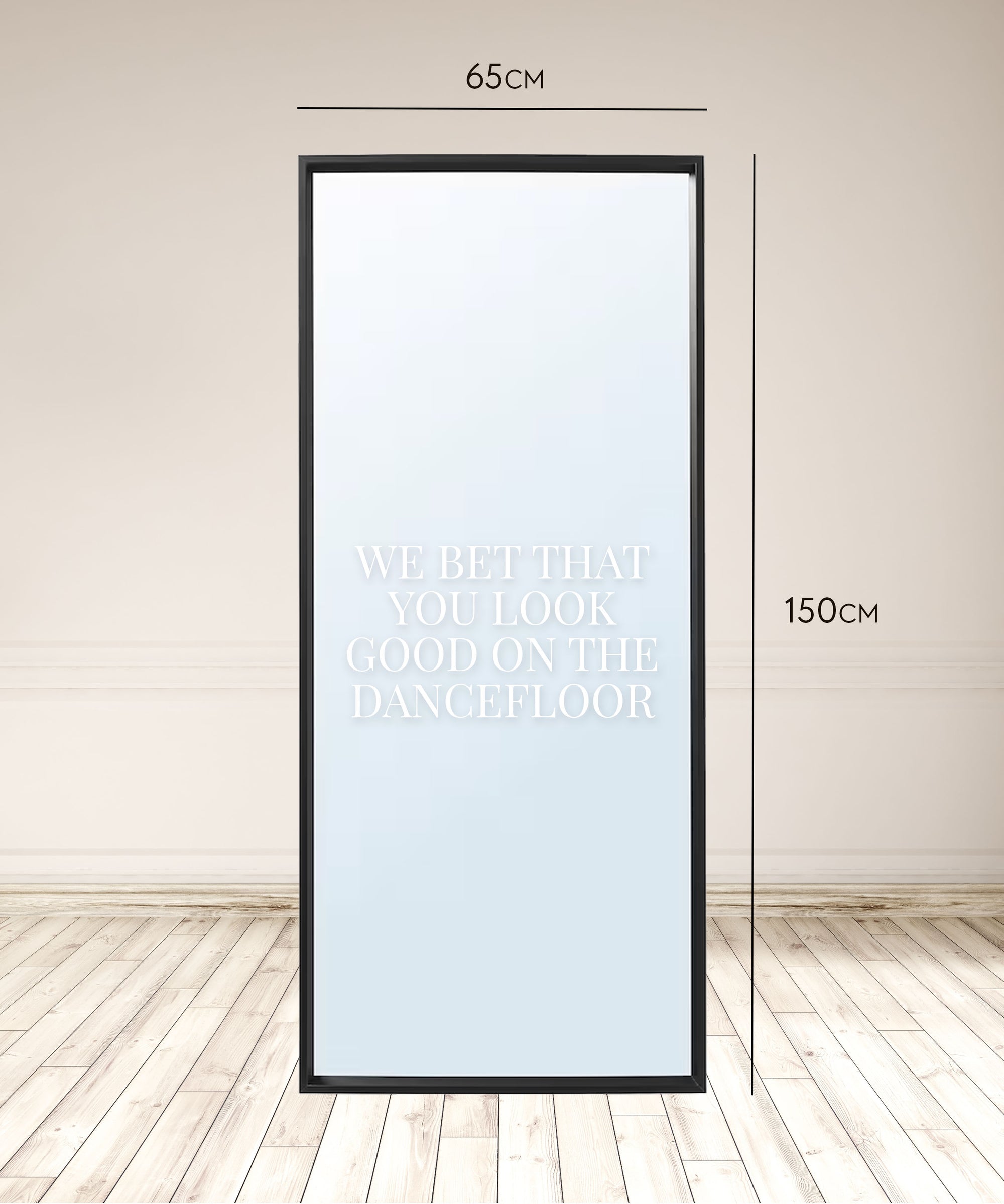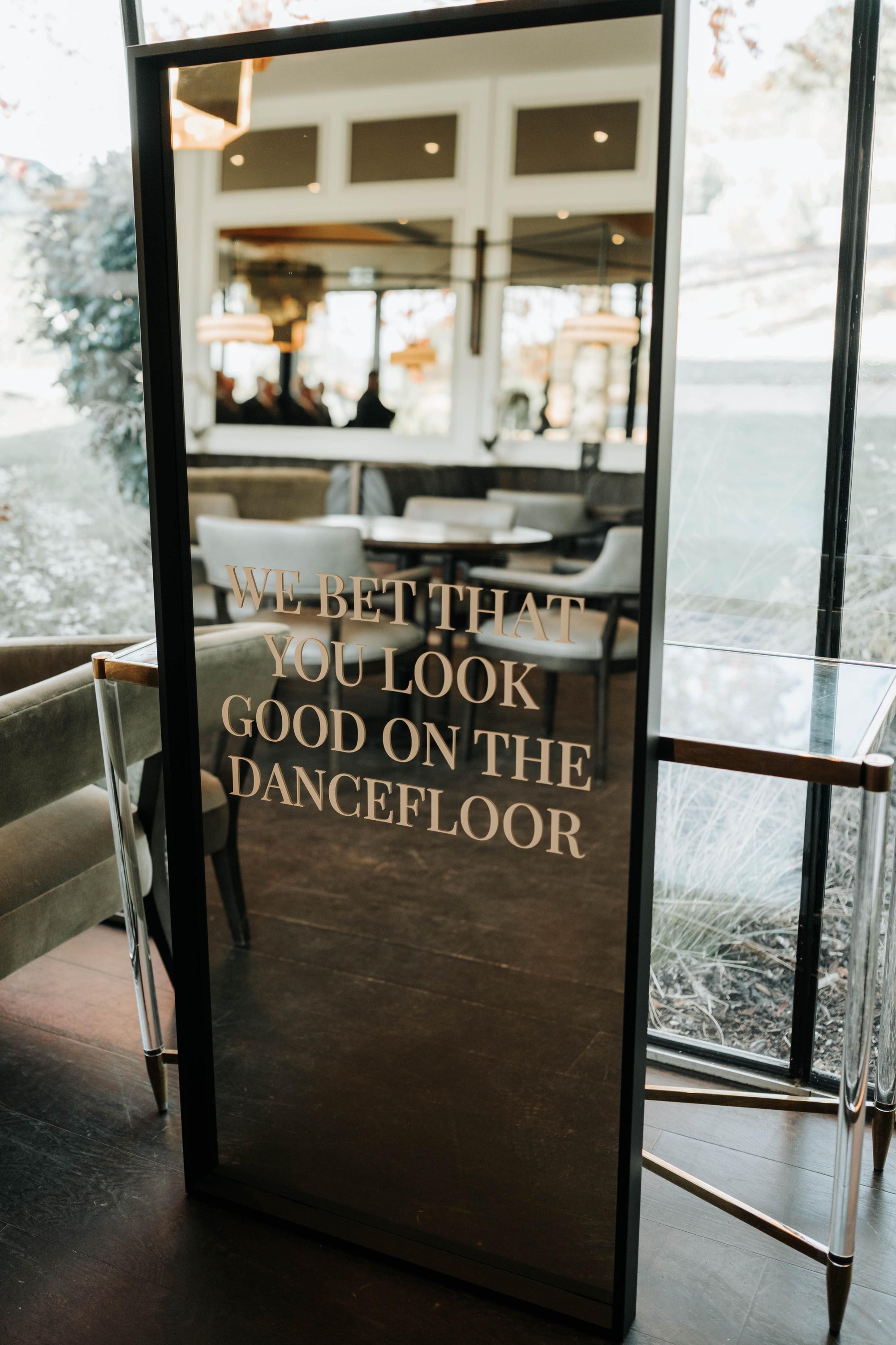 A sleek, modern black framed mirror featuring our 'We bet that you look good on the dancefloor' wording. Designed to suit a variety of wedding styles our mirrors provide the perfect decor for your wedding. Style with florals or candles or a statement display.
