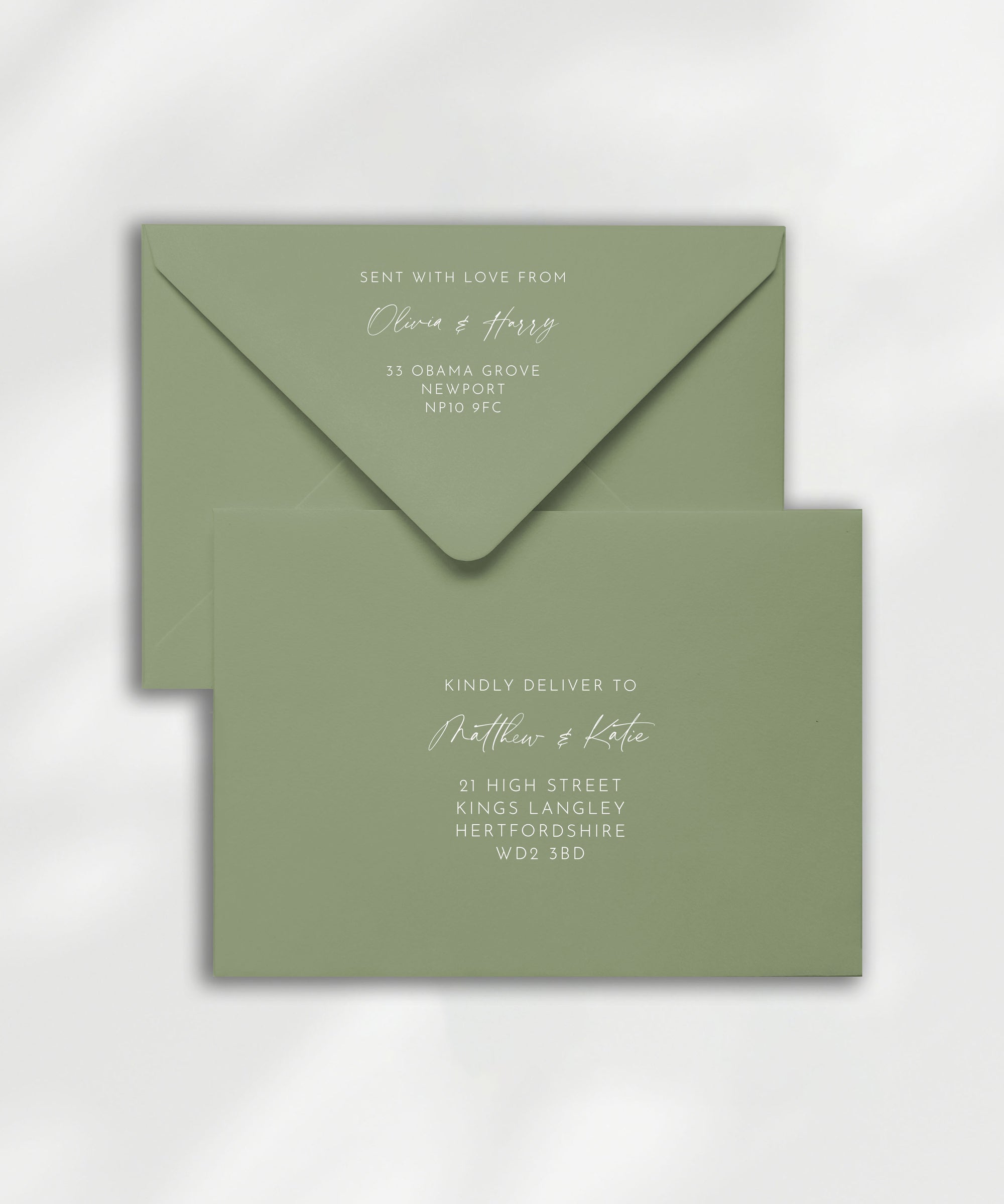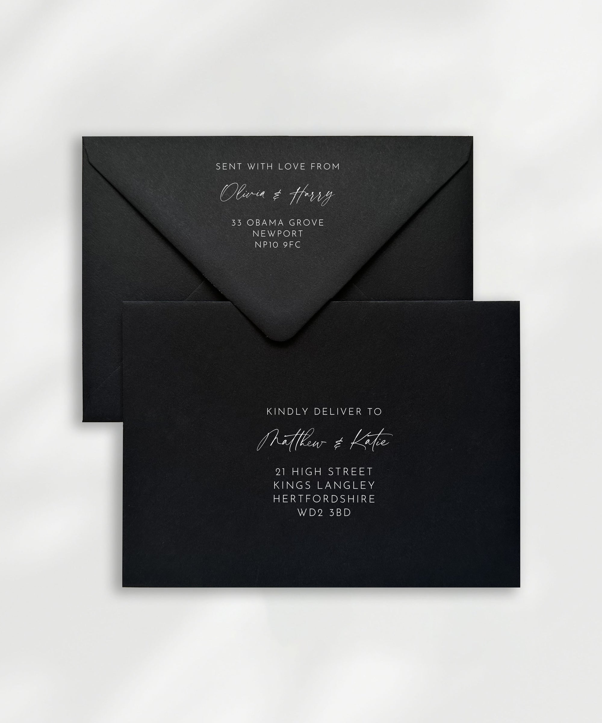 Elevate your envelopes with our guest name and address printing service; perfect for your wedding invitation and RSVP stationery. This listing includes envelopes and address printing.