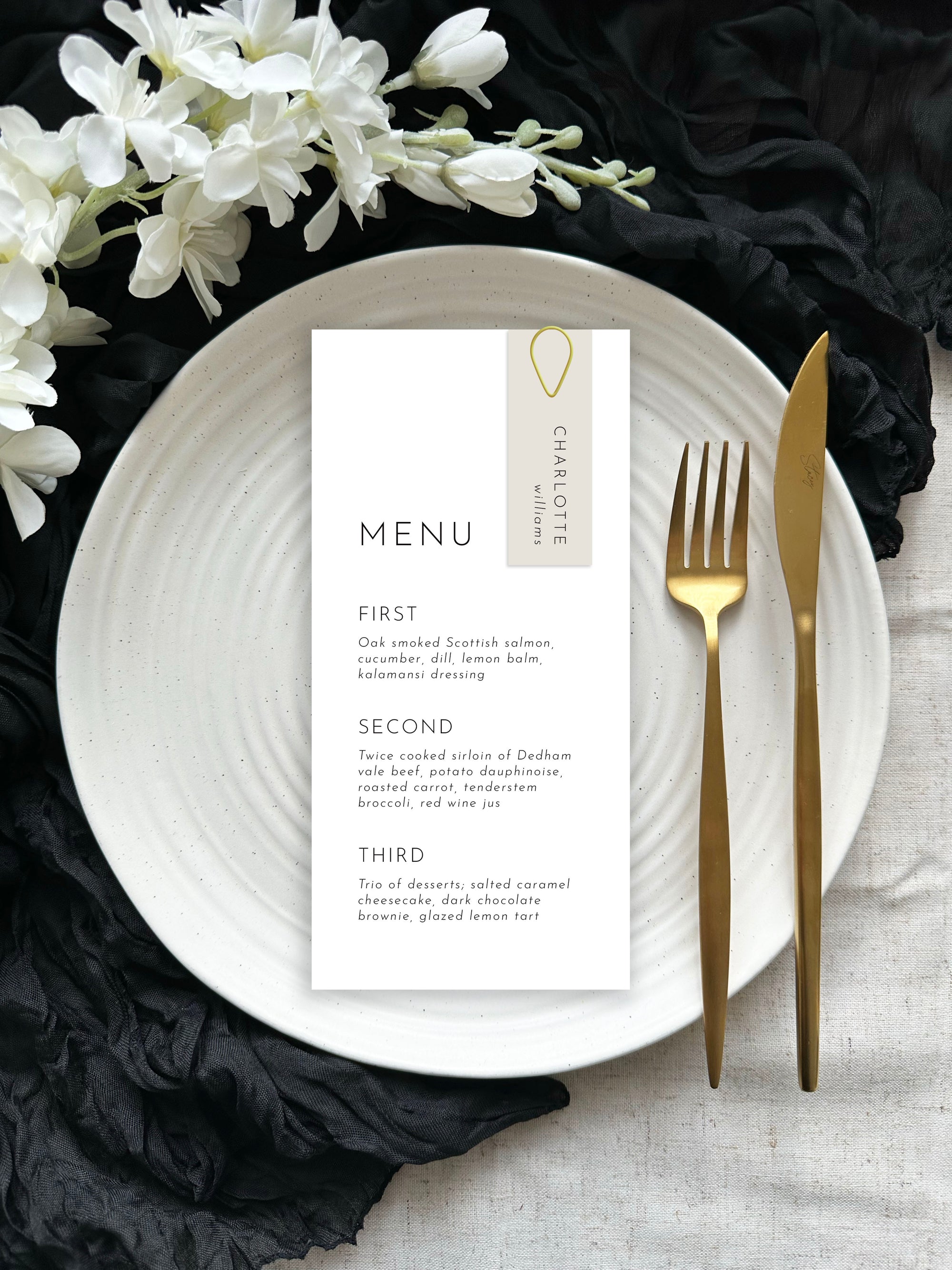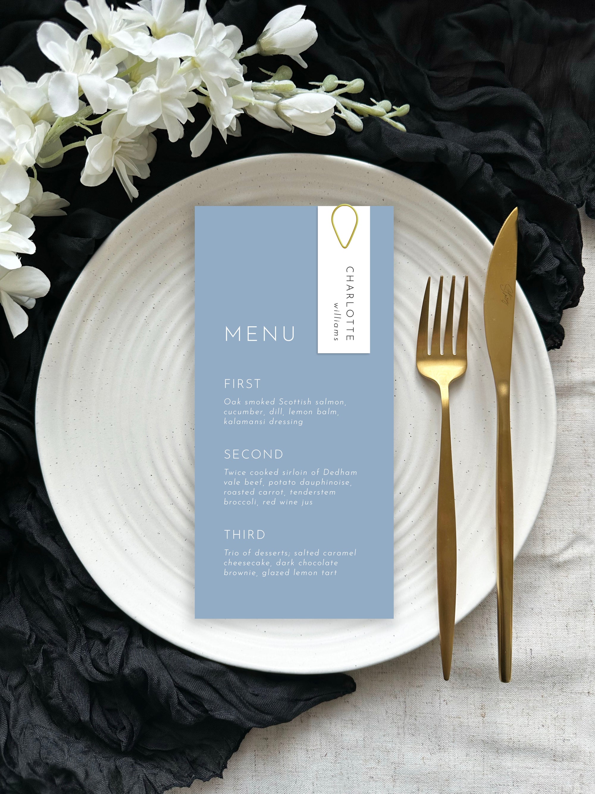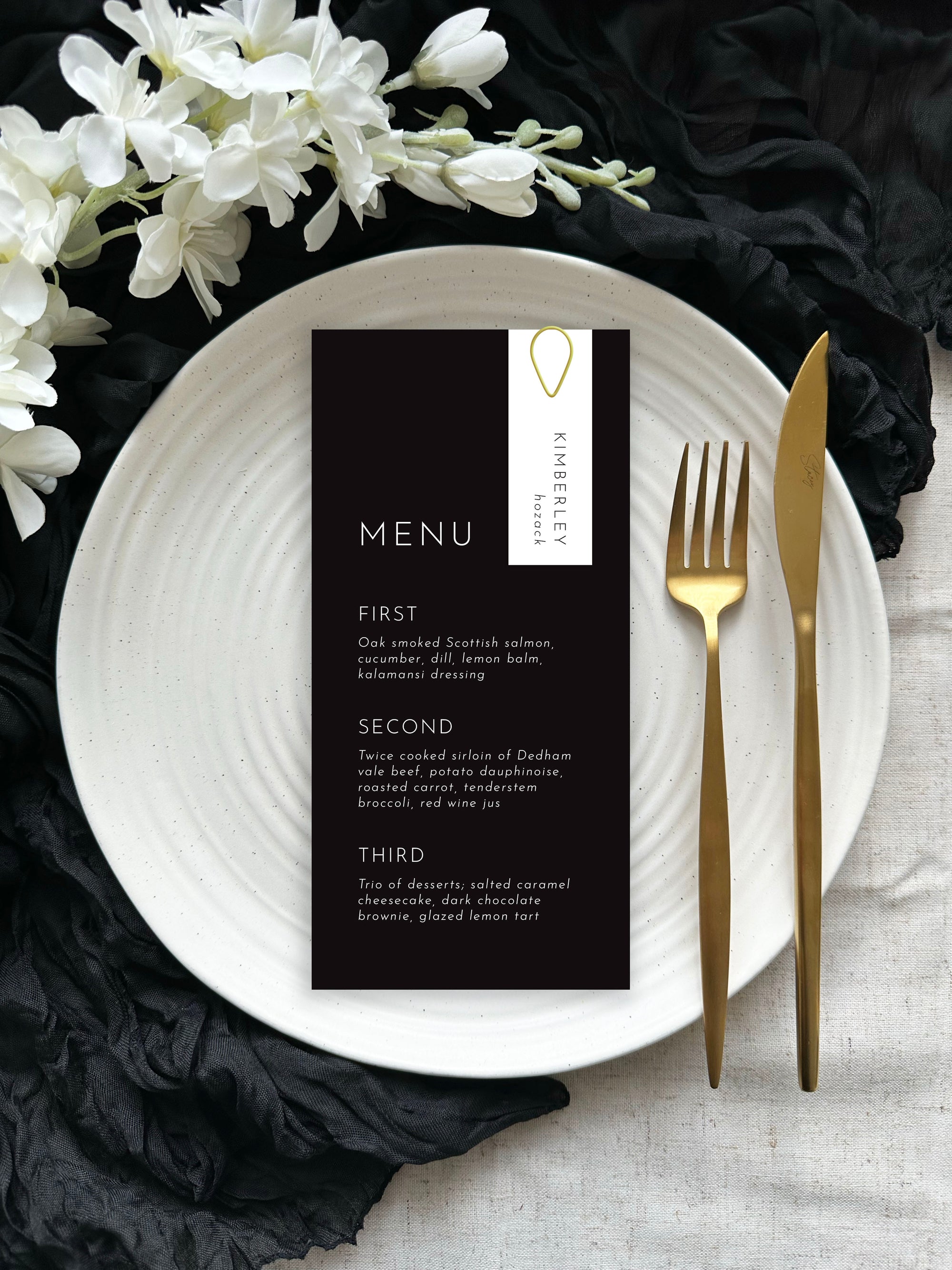Each set includes a menu, guest name tag and clip. The listing price includes one menu variation only, if you require more, please get in touch before ordering. Your menus will arrive unassembled.
