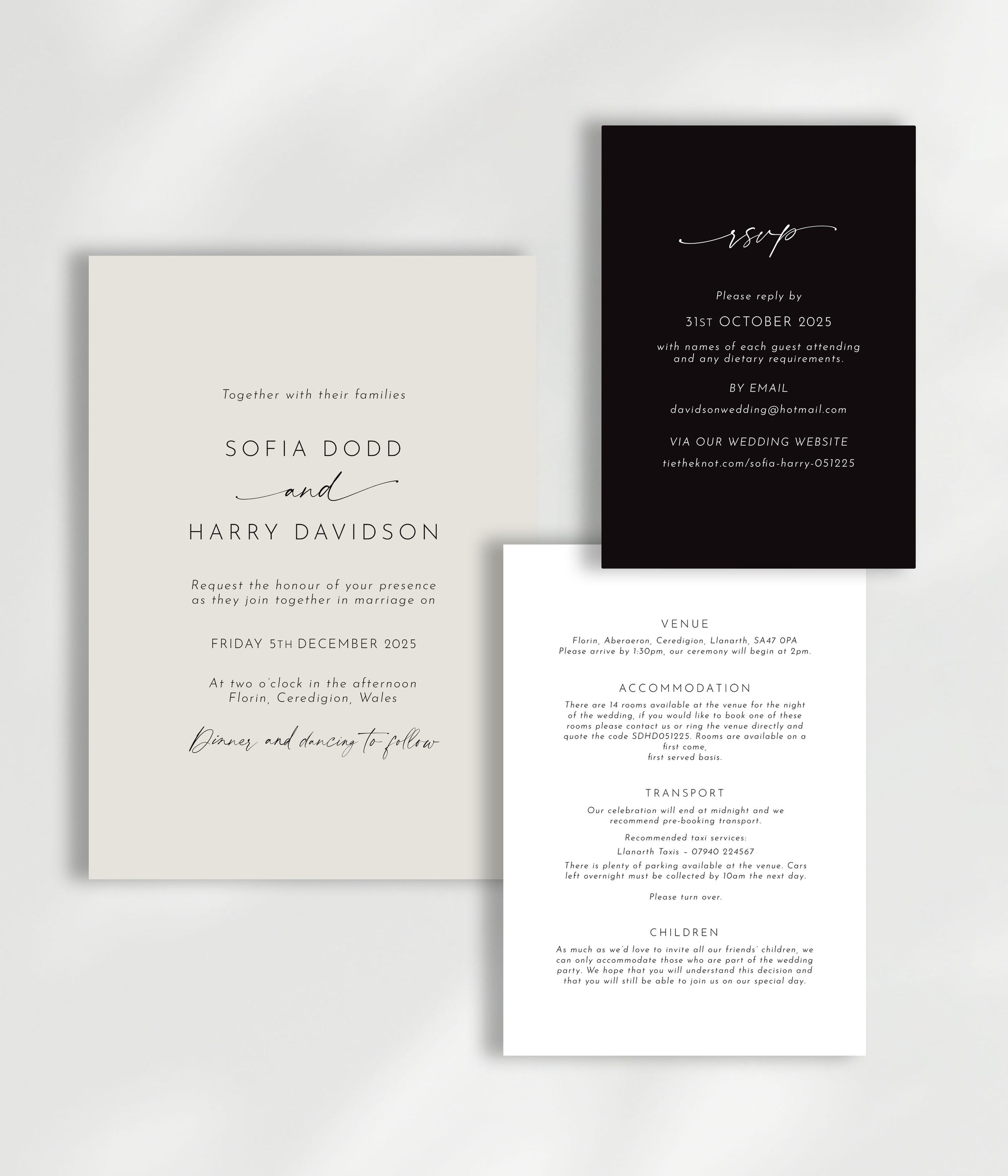 This three card suite contains an invitation card, two additional insert cards (that can be used as a details card, menu card, or RSVP card) and a clip. You will receive a digital copy to approve prior to printing. Your invitations will arrive unassembled.