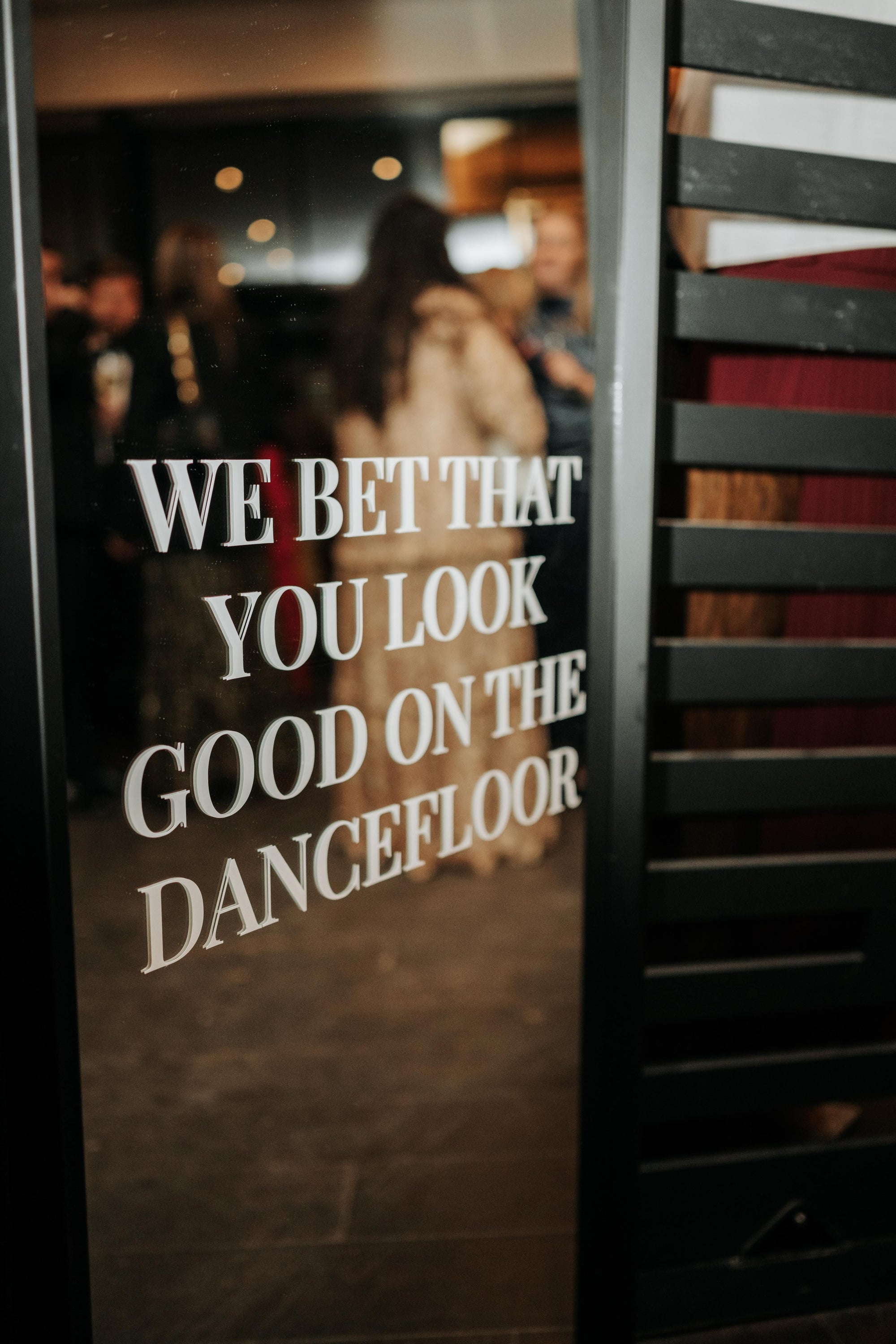 Removable vinyl decal in our 'we bet that you look good on the dancefloor' design and optional personalisation with with your names.