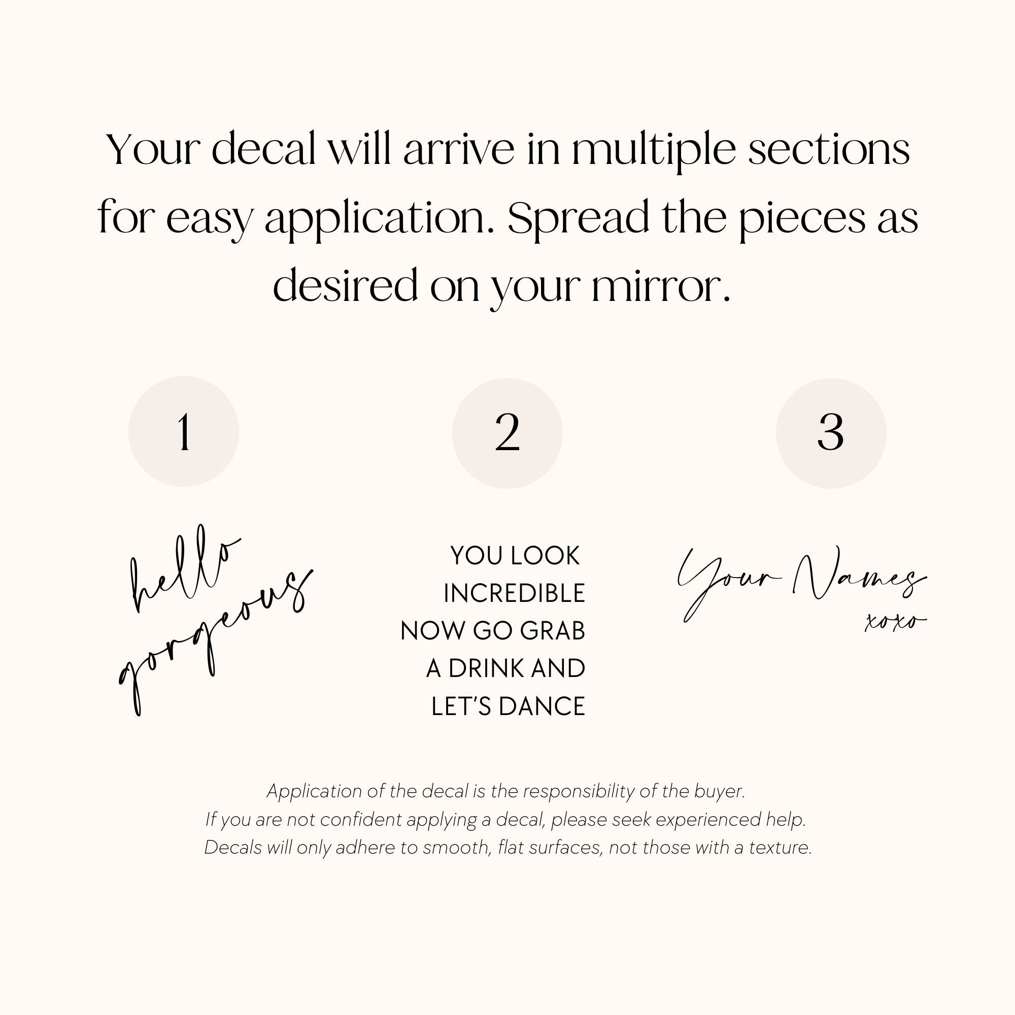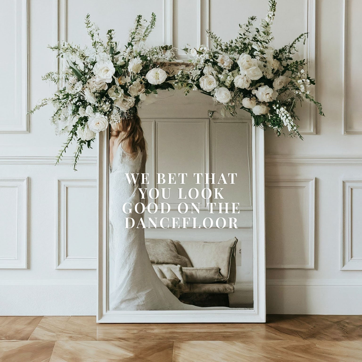Enhance your wedding décor with our versatile vinyl mirror decals, perfect for creating stunning wedding welcome signs, selfie mirrors, or for simply adding to your wedding décor. Made from high-quality removable white or black vinyl, these decals offer an elegant touch to any mirror surface. Choose from our curated selection of designs or why not personalise your decal with your favourite quote!