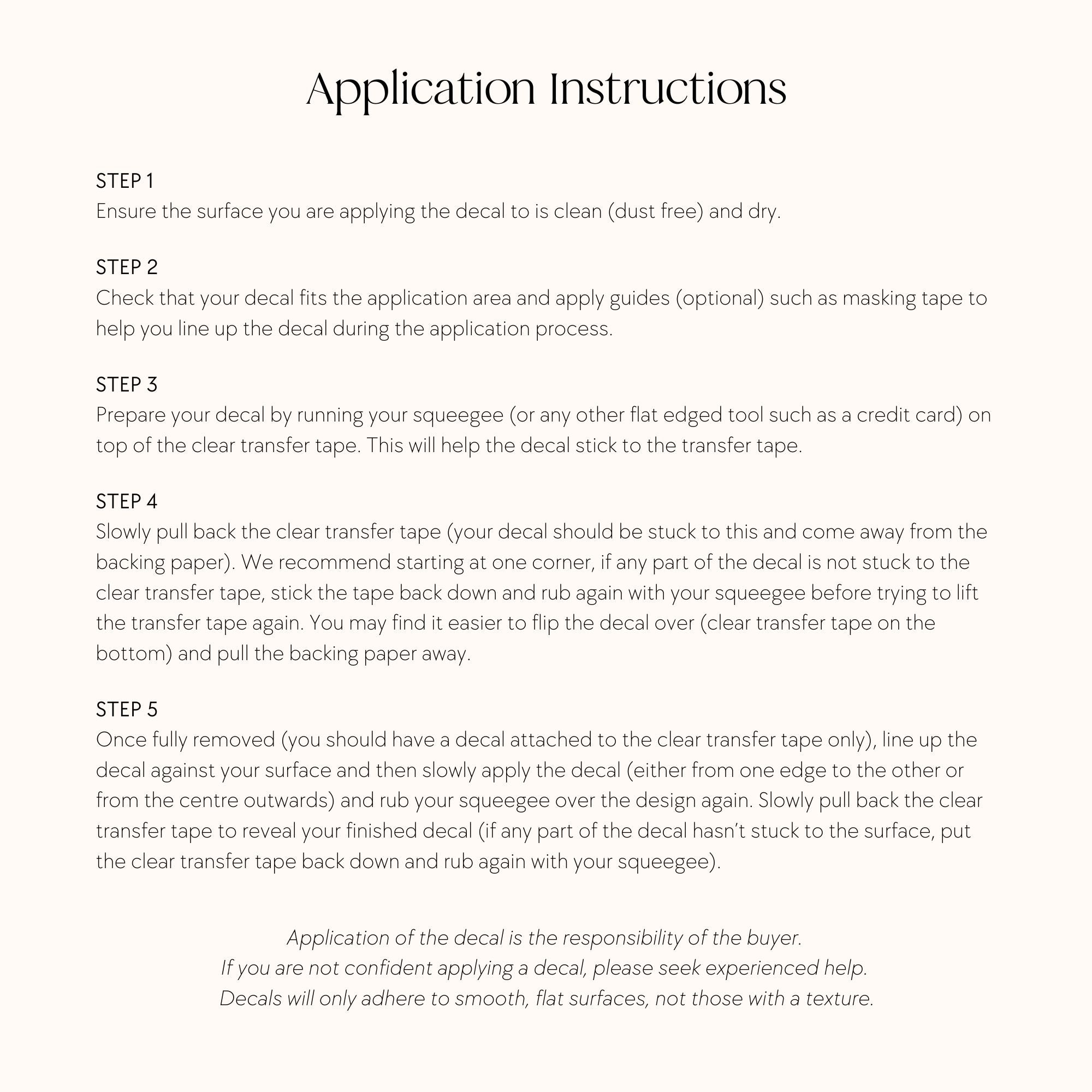 Please see product images for instructions. Application & removal of the decal is the responsibility of the buyer; if you are not confident applying or removing the decal, please seak experienced help. Decals will only adhere to smooth, flat surfaces, not those with a texture.