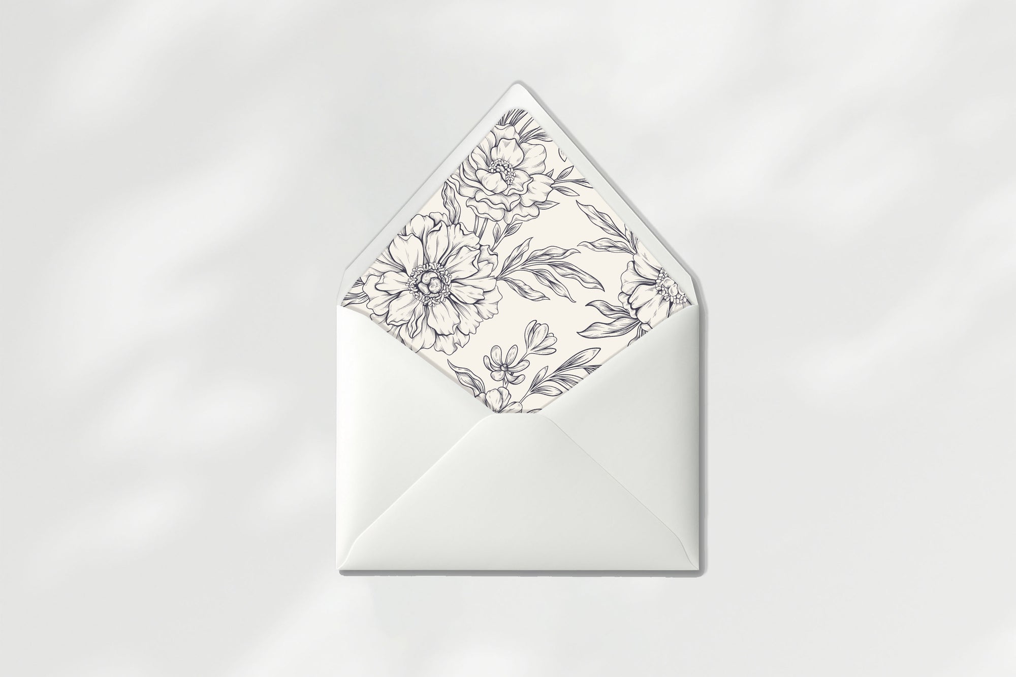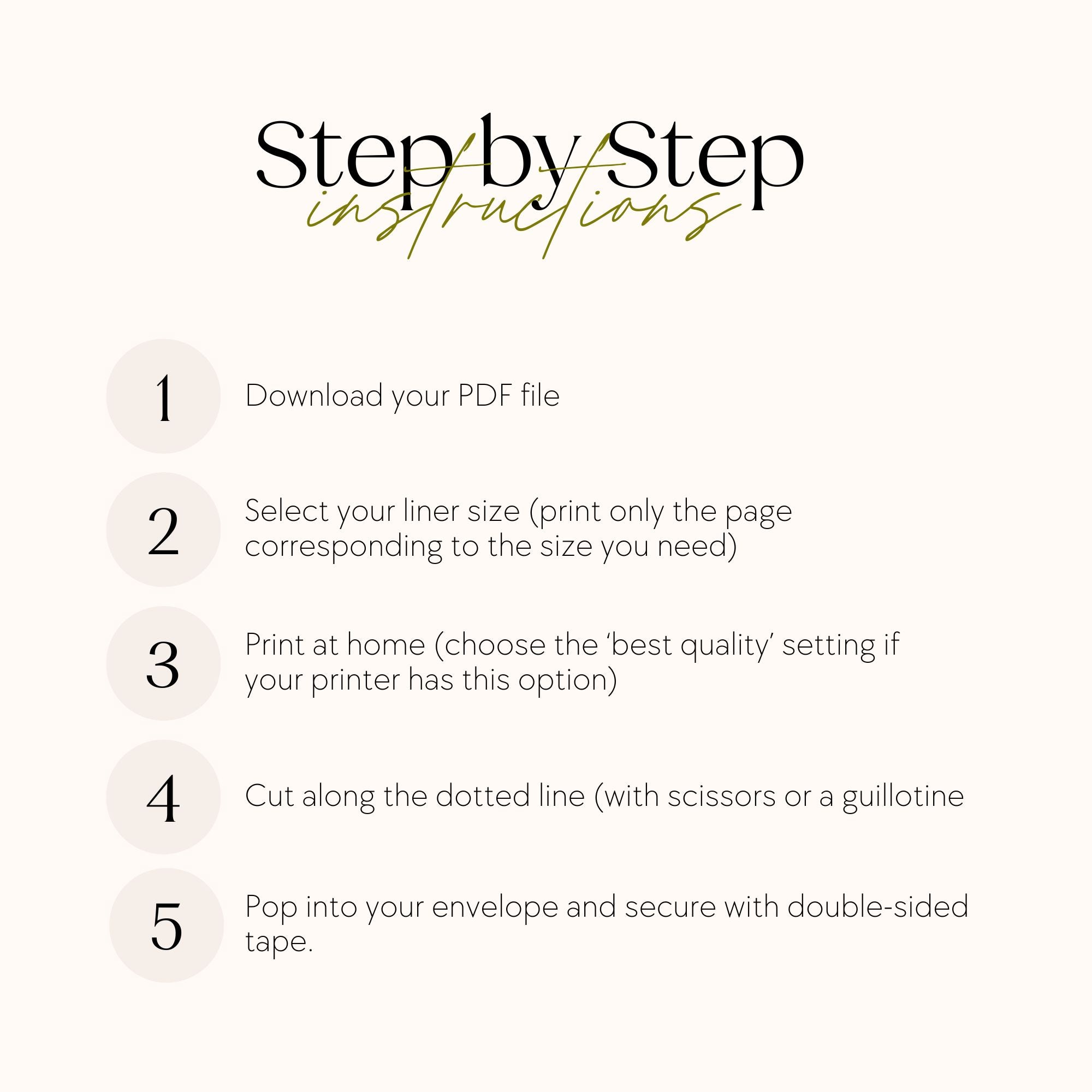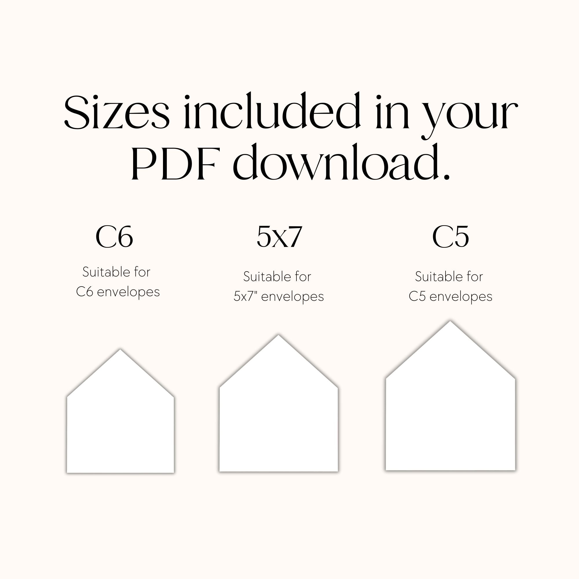 Digital envelope liner template (PDF file). You will not receive a physical product. Our PDF download template contains three sizes for you to choose from: C6 (to fit a C6 envelope), 5x7 (to fit a 5x7" envelope), and C5 (to fit a C5 envelope).