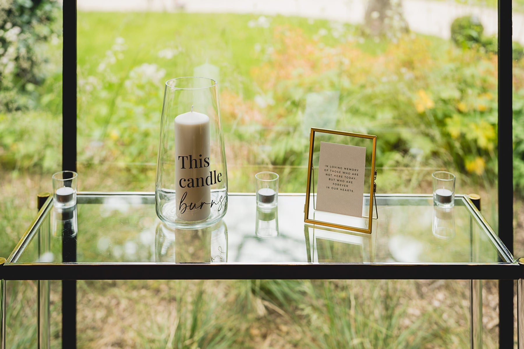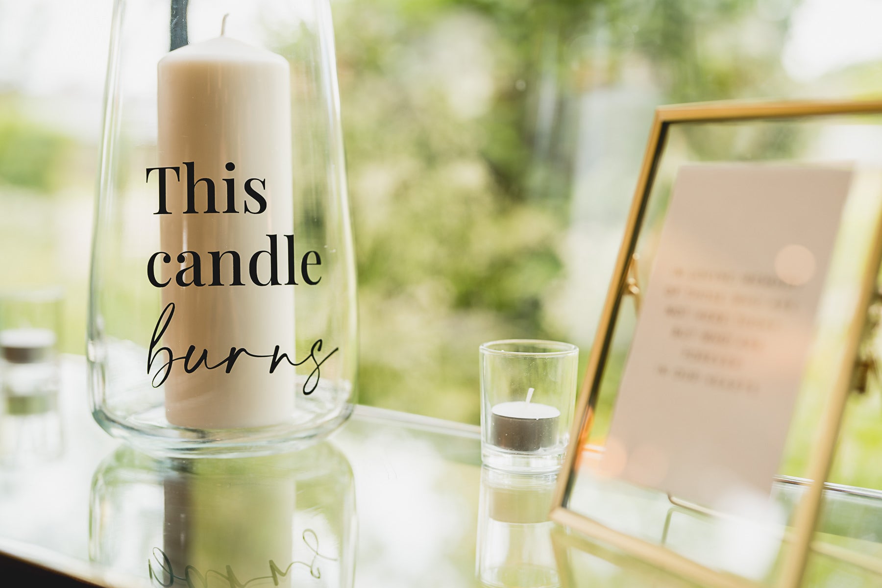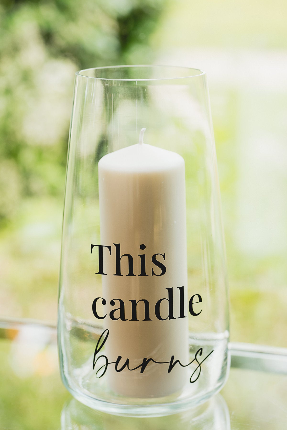 Premium glass hurricane candle holder with 'This Candle Burns' wording. Designed to suit a variety of wedding styles. Style with florals or additional candles for a statement display.